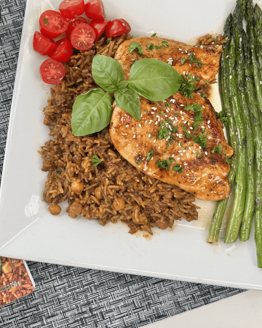 2 minutesPlate the base, sliced chicken, sautéed asparagus, cherry tomatoes, and garnish with fresh parsley.
